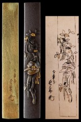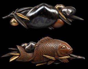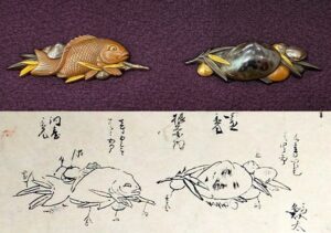 Through a most serendipitous series of recent events, a heretofore unknown secret about the Ichinomiya school of tosogu carvers may have come to light after 200 years. The story begins shortly after my acquisition of a wonderful pair of tai (sea bream) and hamaguri (clam) menuki carved by Ichinomiya Nagatsune ( figures 1 & 2 ).