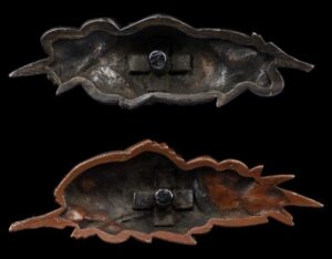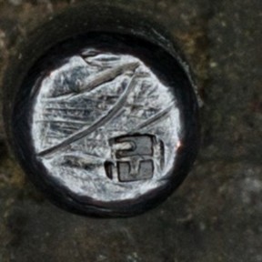 The set of menuki was forwarded to Richard George, a dear friend, professional photographer and fellow fittings collector. Richard’s task was to photograph the menuki for inclusion in an annual journal of tosogu. During this process, Richard noticed distinct marks on the back posts of the menuki ( figures 3, 4 & 5 ).