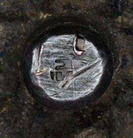 One further point worth mentioning about the secret mark is the time frame in which the stamps were applied to the posts. Magnification of the ends of the full length posts clearly show the original file marks which were applied as part of Nagatsune’s finishing process. Images of the end post stamps were forwarded to another fittings collector who is also a professional jewelry maker for over 45 years. In his professional opinion, the stamps were definitely applied at a point subsequent to the original fabrication of the posts. He advised that when struck, the stamp would have compressed and obliterated the file marks on the bottom of the stamped impression, while those file marks remaining on the outer edges of the stamped area would have been “stretched”. The mark is clearly as described, thus evidencing that Nagatsune’s filing and finishing processes on the menuki posts had preceded the application of the stamp.