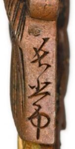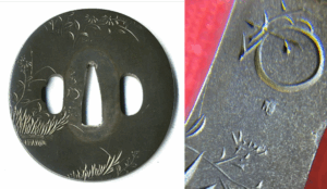The second of these two privately owned items containing the stamp was a shibuichi tsuba which, like the fuchikashira, was also carved in Nagatsune’s classic katakiri bori style ( figures 18 & 19 ). The secret stamp on this tsuba was