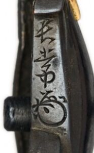 With so many gimei pieces being circulated in the marketplace, and with the authentication documents being swapped out to accompany the fakes, it is not unreasonable to assume that Nagayoshi would therefore go one step further and begin to secretly and permanently mark the shoshin ( genuine ) Nagatsune fittings that were coming in for authentication. This would allow the family and the subsequent Ichinomiya generations to tell which pieces had already been vetted by their family. The mainline Goto masters did the same thing when a later generation was retained to authenticate the work of an earlier generation. After doing so, they would issue a formal origami to the tosogu owner as proof of same, and make a duplicate origami for the Goto family records. At the same time, and unbeknownst to that owner, they would carve a secret mark at a prescribed location on the fitting known only to the Goto family. It has been assumed that these marks were kept a secret by the family so that if a subsequent Goto generation was asked to authenticate a sword fitting, he would instantly know that that fitting had already gone through their vetting process. He could then check the Goto family records, and duplicate the earlier results. He certainly would not have wanted to contradict the attribution of an earlier generation’s kantei. For over 400 years, the 17 generations of the mainline Shirobei Goto were know for their scrupulous and private record keeping. The knowledge of their secret marks was only revealed in the late 19th or early 20th century. These Goto secret marks were only tiny “v” chisel cuts applied in secret but prescribed locations. It is our suggestion that Nagayoshi went one step further than the Goto for the vetting of his grandfather’s work, and created a secret microscopic kakihan or chop stamp. This stamp left a mark that was even smaller than the Goto secret marks. Even if inadvertently discovered, Nagayoshi’s stamp would have been exceedingly difficult to recreate. Also as stated, the Nagayoshi stamp is invisible to the naked eye, so the chance of discovering it was exceedingly small.