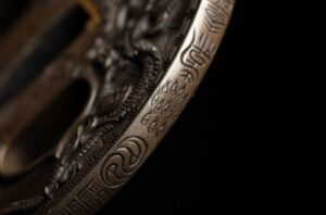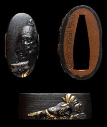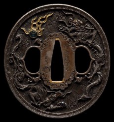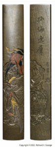Ichinomiya Nagatsune was born in 1721 and died in 1786 at the age of 66. Along with Otsuki Mitsuoki and Tetsugendo Shoraku, he is considered to be one of the 3 greatest Machibori masters from Kyoto in the Edo period, and was famous and collected even during his lifetime. These 3 master carvers from Kyoto were for the most part working for a sophisticated clientele of nobility and wealthy industrialists. Wakayama Takeshi, one of Japan’s foremost tosogu scholars, personally considered Nagatsune to be one of the 4 or 5 greatest carvers in all of Japan. It has recently come to light that many of the master carvers of the machibori tradition were quite well educated. The relatively obscure subject matter frequently chosen by Nagatsune for his motifs would certainly indicate that he was quite well read. It is also known that Nagatsune studied drawing under the great master painter Maruyama Okyo, and those